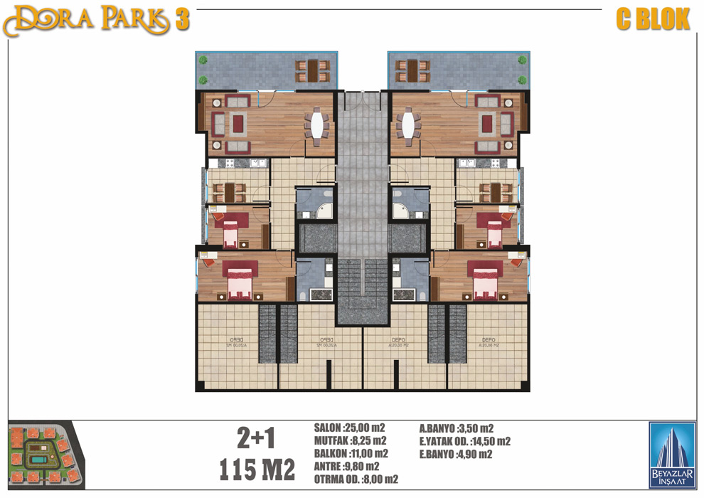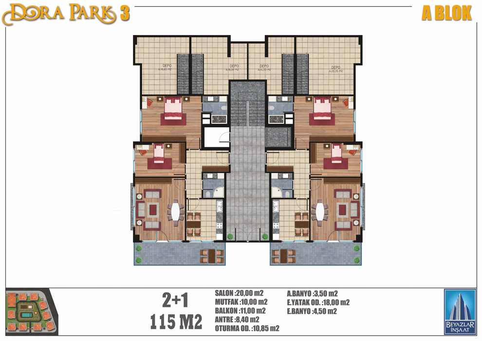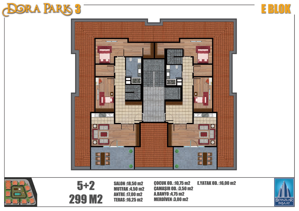 Peyzaj alanımız 7.500 m2’dir. 5.000 m2’lik bina oturumumuz bulunmaktadır. Projemiz bünyesinde 2+1, 3+1, 4+1, 5+2 ve 6+2 daire tipleri mevcuttur.