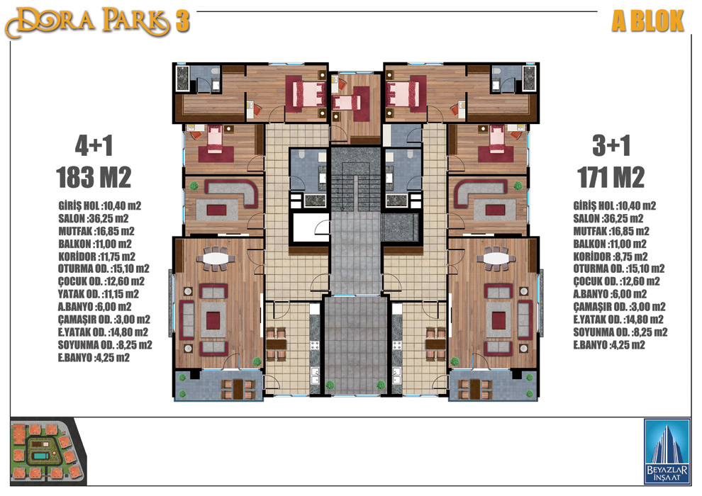 Peyzaj alanımız 7.500 m2’dir. 5.000 m2’lik bina oturumumuz bulunmaktadır. Projemiz bünyesinde 2+1, 3+1, 4+1, 5+2 ve 6+2 daire tipleri mevcuttur.